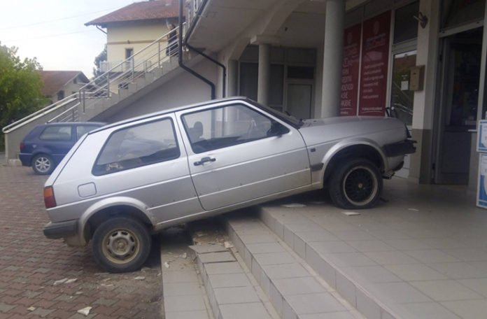 Nesvakidašnja nezgoda dogodila se danas u Derventi, na parkingu jednog poslovnog objekta, nakon što je žena “upalila” svoj automobil Golf 2, a potom ga “parkirala” na stepenice isred radnje sa računarskom opremom i kreditnom kacelarijom.