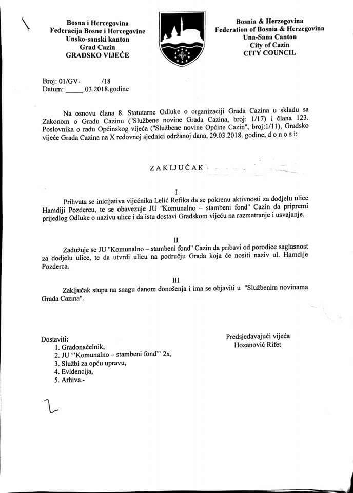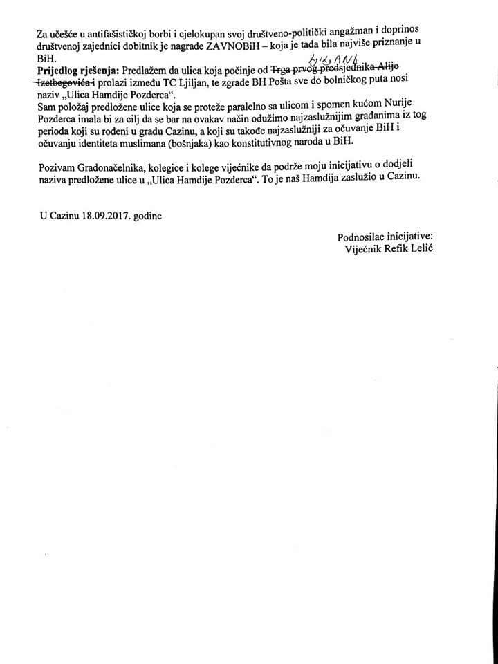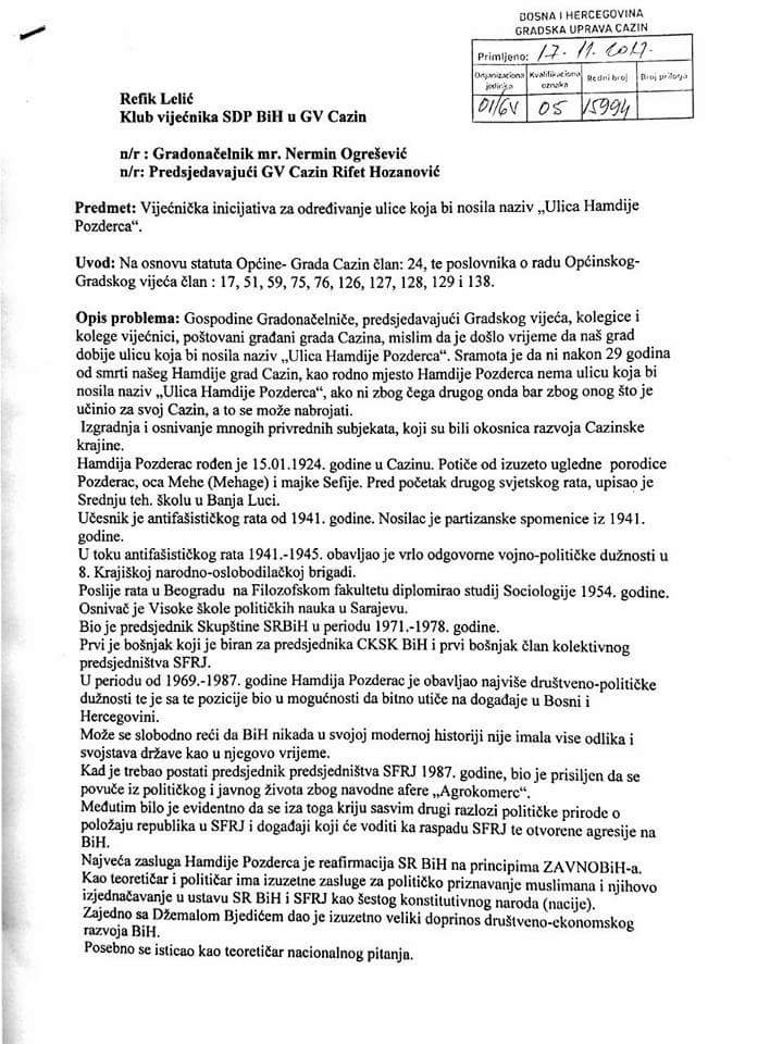 Na današnjoj sjednici GV Cazin usvojena je inicijativa vijećnika SDP-a Refika Lelića o dodjeli naziva ulice Cazinskom velikanu Hamdiji Pozdercu.