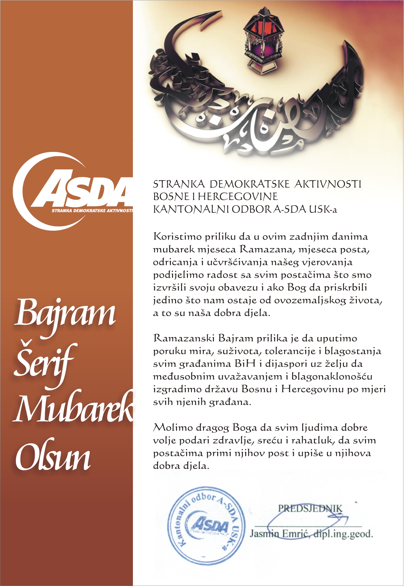 Čestitku povodom predstojećeg praznika, Ramazanskog Bajrama, uputili su i iz stranke A-SDA.