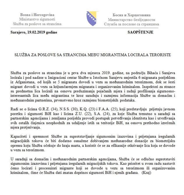 “Radi se o osobama inicijala G. R. Z. (34), N. S. S. (30), K. Q. (23) i F. A. A. (25) koje predstavljaju prijetnju javnom poretku i sigurnosti BiH, kao i osobama Z. U. (22), S. A. (24) za koje služba trenutno u saradnji sa partnerskim agencijama i zemljama porijekla provodi postupak potvrđivanja identiteta, kao i utvrđivanja svih ostalih činjenica neophodnih za njihovo udaljavanje s teritorije BiH, na osnovu prethodno izrečenih mjera protjerivanja”, piše u saopćenju za javnost Službe za poslove sa strancima BiH.