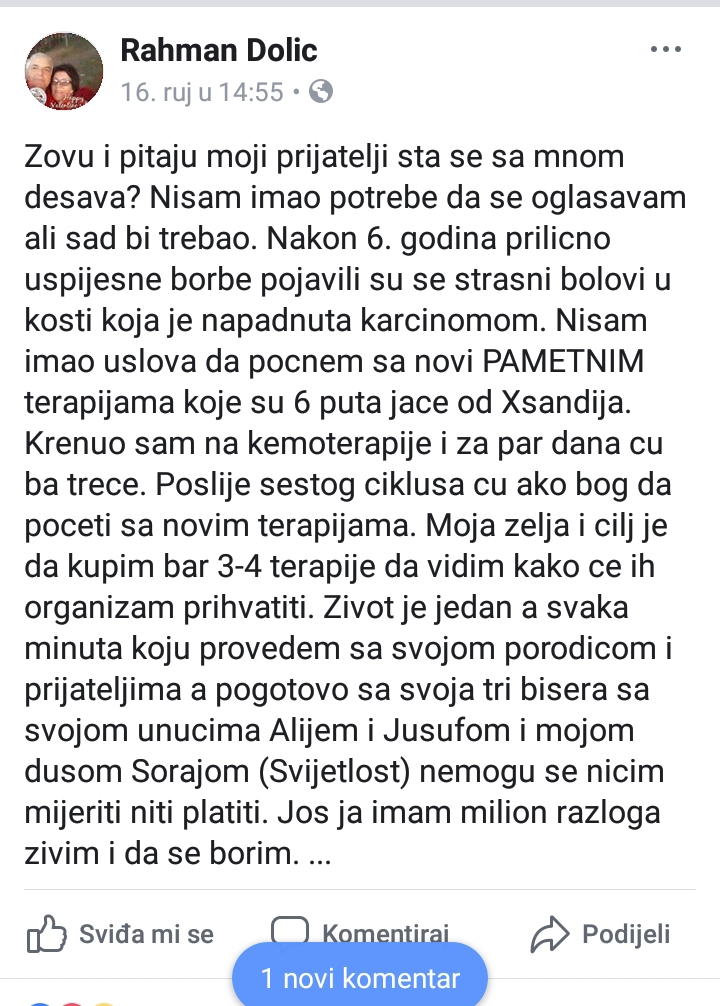 Hoćemo li još jednom pokazati svoju beskonačnu humanost? Vjerujem da hoćemo, jer i Rahman vjeruje u nas. Pomozimo mu da počne s novom terapijom, da lakše podnese bolne kemoterapije i da još dugo vremena uživa sa svojim najmilijima, što mu i jeste najveća želja.