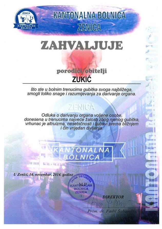 “Znači mi puno što smo donirali organe i ponosimo se tom odlukom. Bila je to prva kadaverična transplantacija u KBZ-u, odnosno u FBiH. Opet bih isto odlučio. Molim sve ljude ovog svijeta, ako im se ne daj Bože desi isto ili slično, da slijede naš primjer”, kazao je otac Sead.