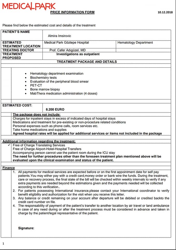 Aplicirajući na razne klinike van naše zemlje, porodica Imširović je dobila predračun iz Turske koji iznosi 8.200€. Ova suma novca uključuje samo pretrage i nije konačna. Ali je suma koju je zajedničkim snagama i uz podršku dobrih ljudi, koji su bezbroj puta dokazali svoju humanost, moguće prikupiti.
