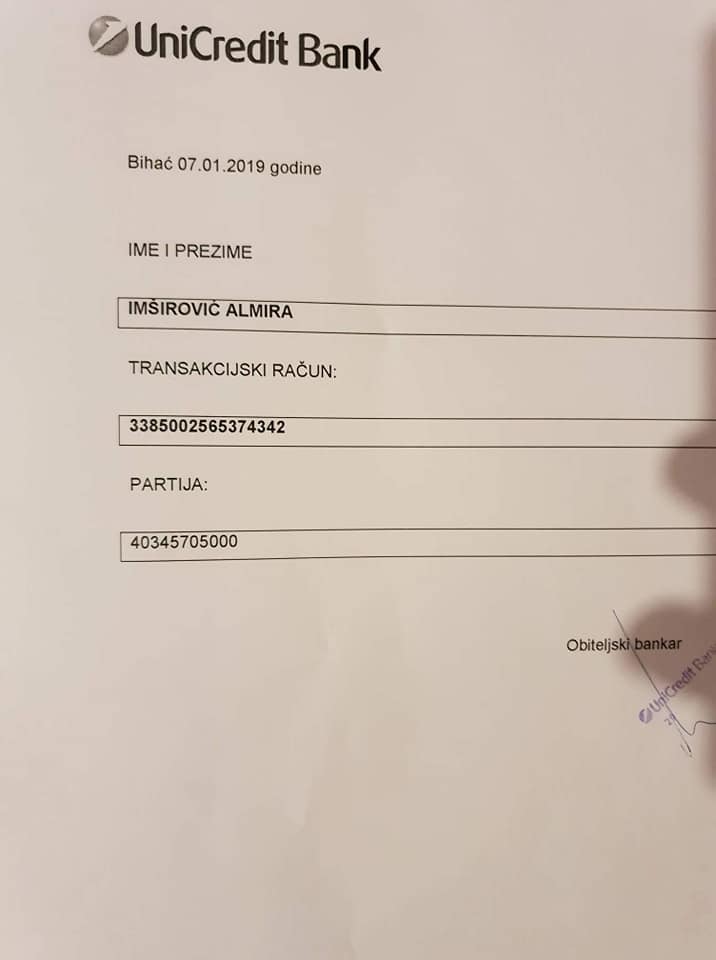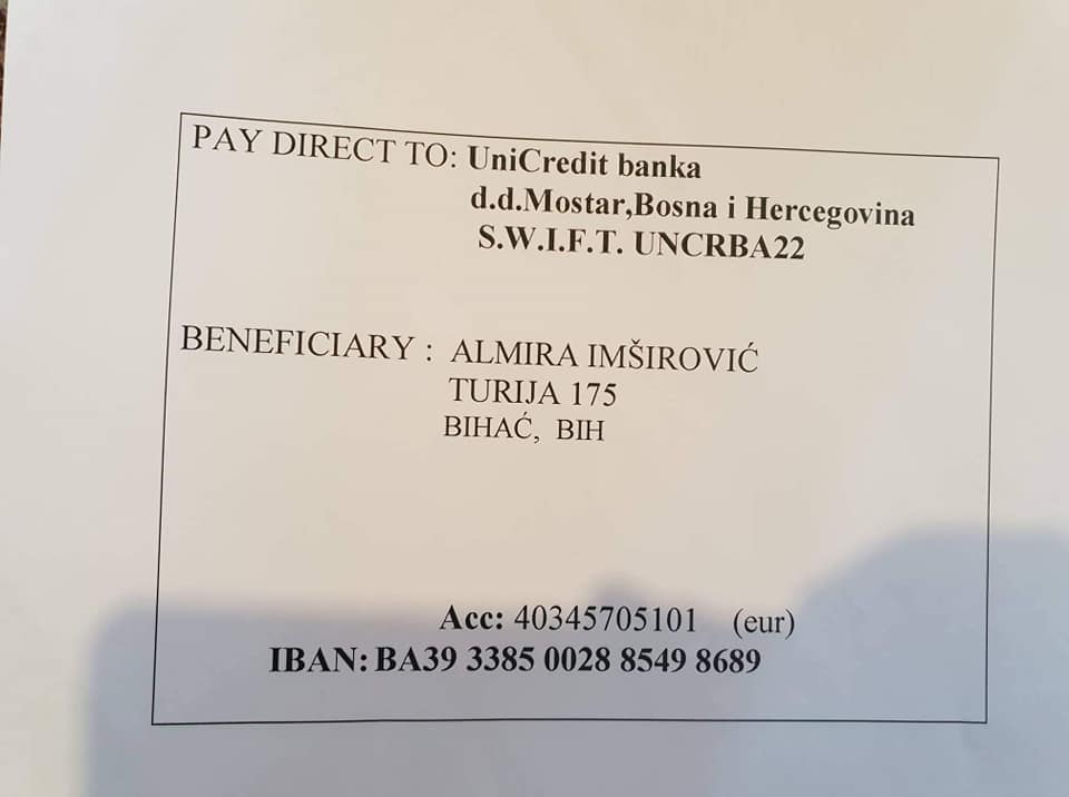Ovim putem apelujemo na sve ljude dobre volje da pomognu ovoj mladoj ženi i u skladu sa svojim mogućnostima izvrše uplate na dolje navedeni broj računa kako bi Almira mogla da nastavi liječenje u Turskoj i živi normalnim životom sa svojim suprugom i djecom.