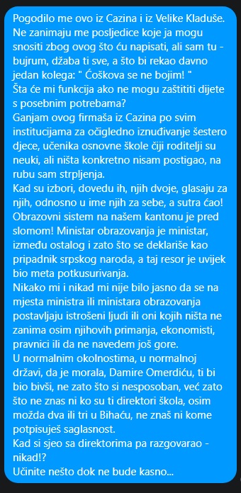 U normalnim okolnostima, u normalnoj državi, da je morala, Damire Omerdiću, ti bi bio bivši, ne zato što si nesposoban, već zato što ne znas ni ko su ti direktori škola, osim možda dva ili tri u Bihaću, ne znaš ni kome potpisuješ saglasnost.