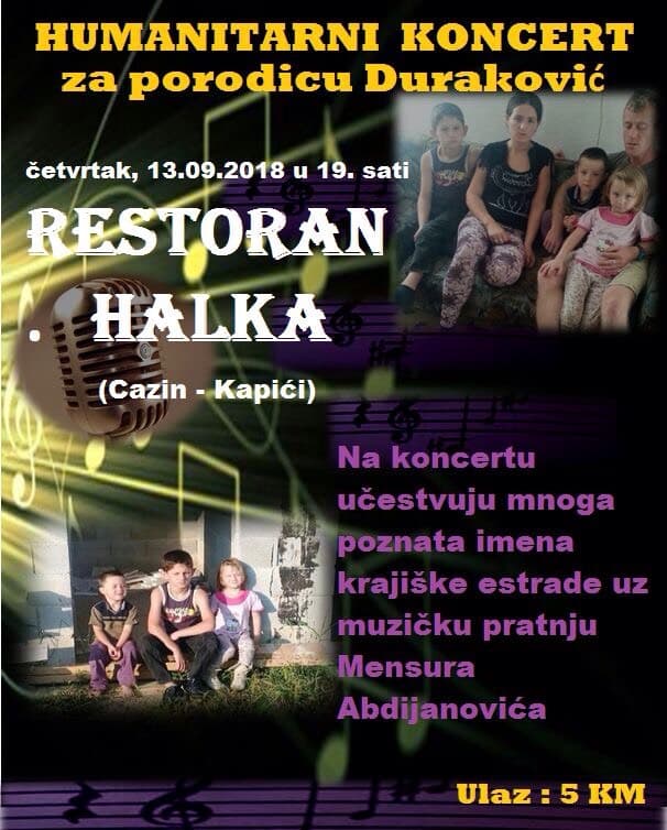 U restoranu Halka Kapići, u četvrtak, 13.09.2018. godine, održat će se humanitarni koncert za porodicu Duraković s početkom u 19:00 sati.