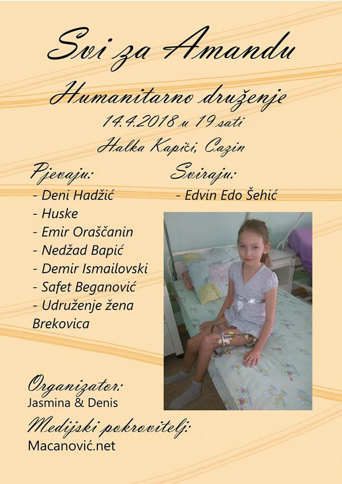 U subotu 14.04.2018. u restoranu Halka Kapići Cazin, održat će se humanitarno druženje za 11-godišnju Amandu kako bi se skupila finansijska sredstva za operaciju koju mora obaviti u ortopedskoj klinici Speising u Beču.