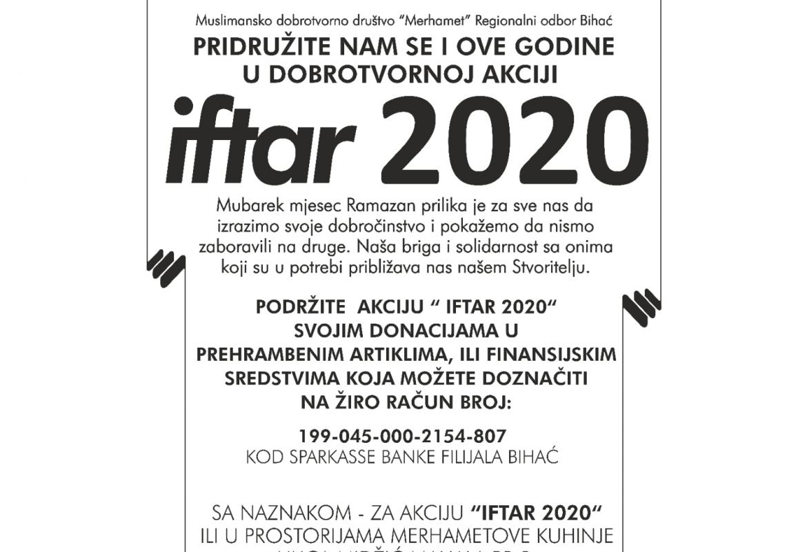 Obzirom na trenutnu epidemiološku situaciju, planiramo organizovati dostavu gotovih iftara na kućnu adresu i podjelu prehrambenih paketa za socijalno-ugrožene osobe i starije osobe na području Regionalnog odbora, te preuzimanje iftara u javnoj kuhinji.