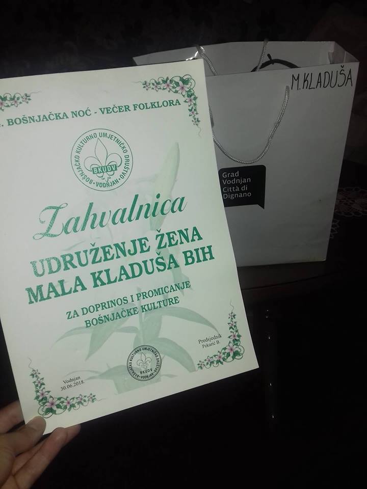 Posebno nam je drago da je naše UŽ “Mala Kladuša”,ove godine na manifestaciji imalo nastup, koji su po prvi put nastupali u Hrvatskoj, tačnije u gradu Vodnjanu. Ovaj nastup zaista će nama biti posebno zapisan u sehari uspomena, jer je organizacija bila veoma odlična- kazala je predsjednica pomenutog UŽ, Sanajda Muratović